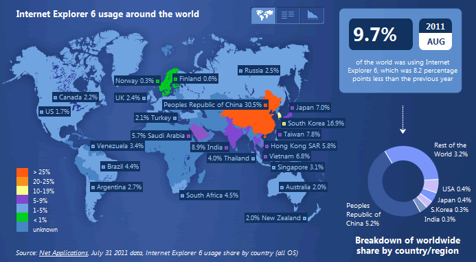 IE9 も出たし、マイクロソフトのほうもIE6 なんかとっくにお払い箱にしたいところではありますが、未だに世界でしつこく使用されているんですよね。
